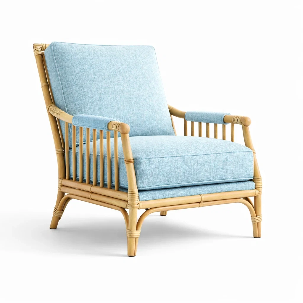 Fauteuil en rotin et tissu bleu clair