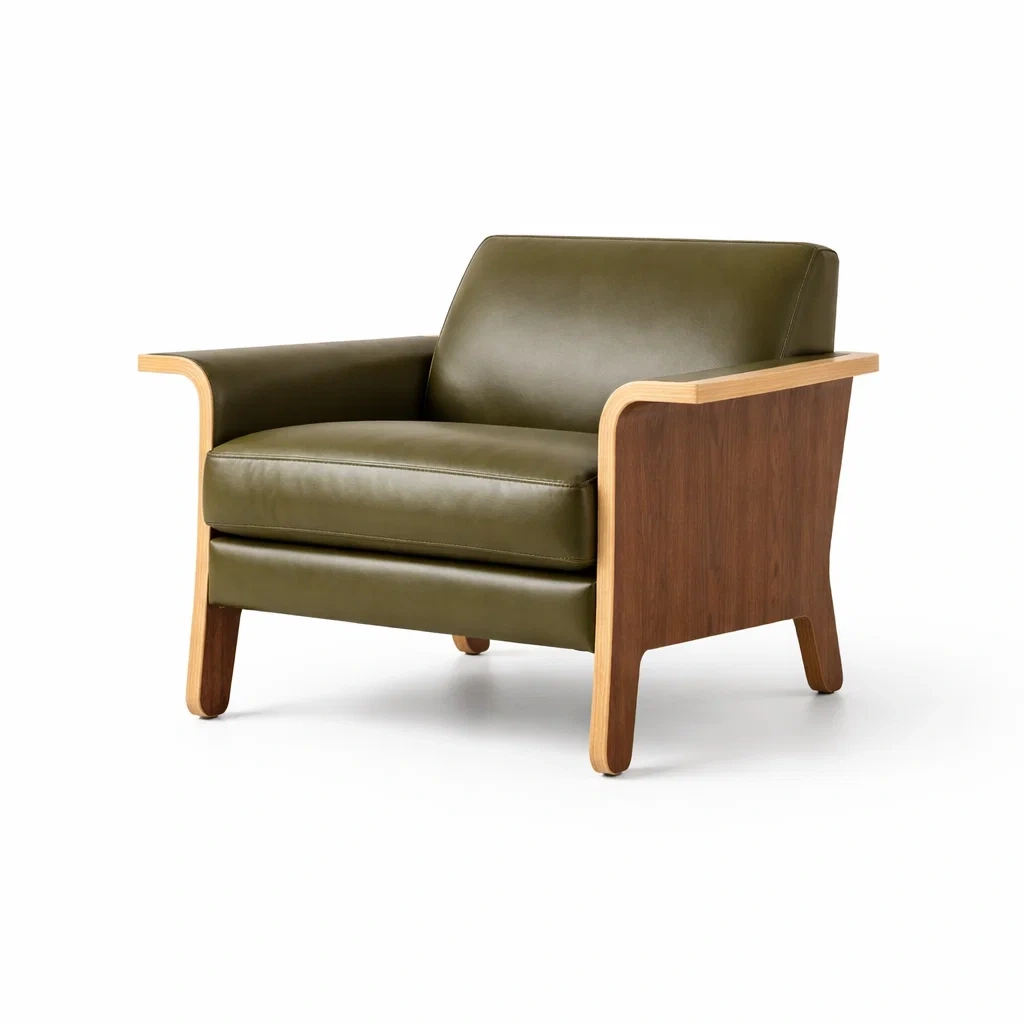 Fauteuil en bois et cuir synthétique vert olive