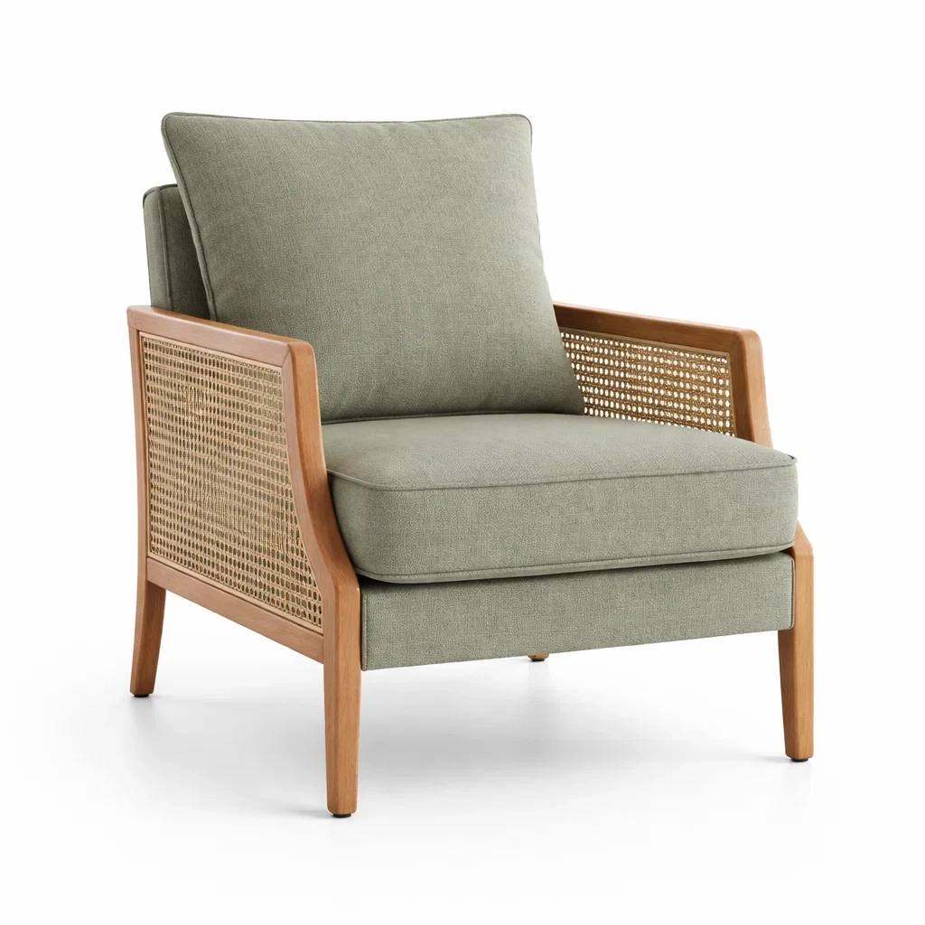 Fauteuil en bois avec tissu en polyester et cannage en rotin