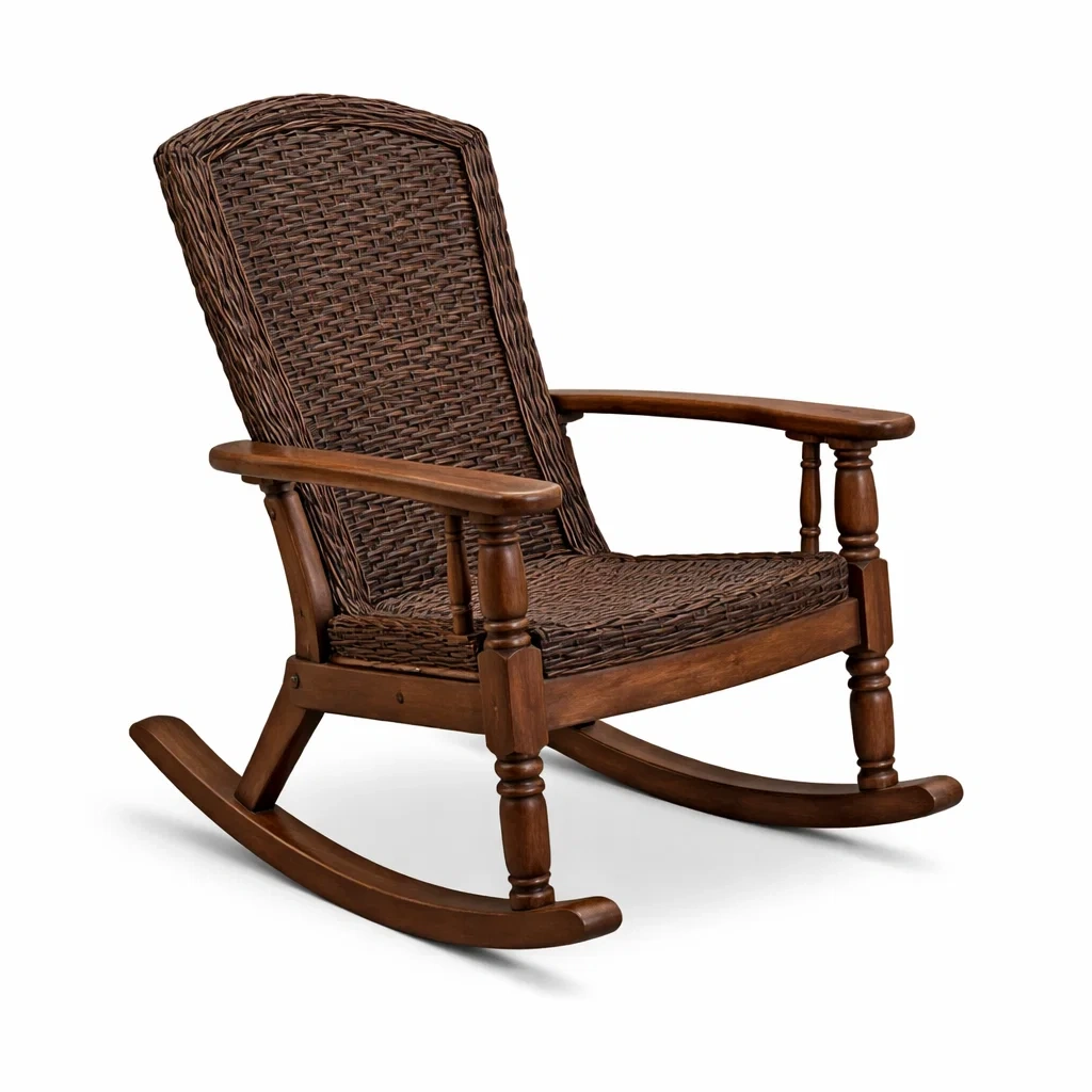 La chaise à bascule est fabriquée en bois massif avec une assise et un dossier en rotin tissé. Elle mesure 80 cm de longueur, 60 cm de largeur et 100 cm de hauteur. Le poids total est de 15 kg. La couleur Marron avec un vernis de protection met en valeur le design. La capacité de charge est de 120 kg.