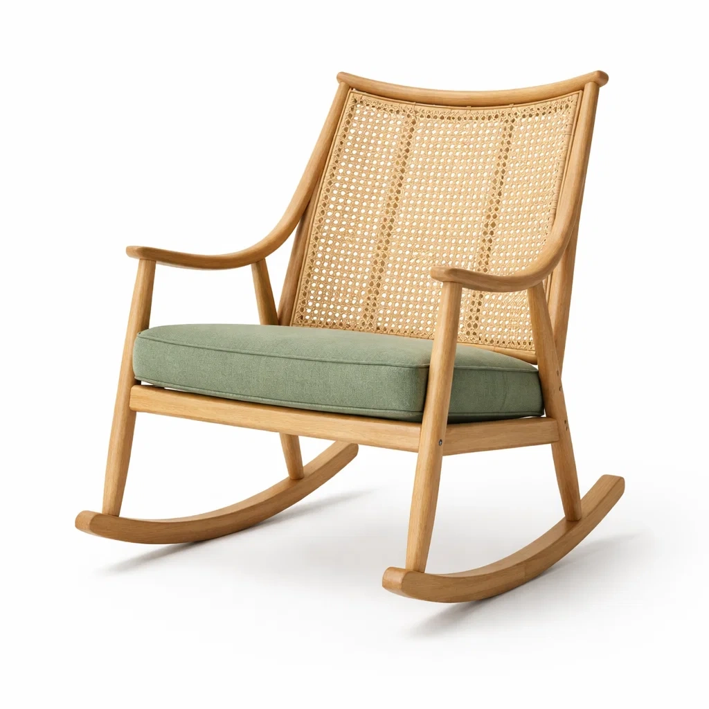 Fauteuil à bascule avec cadre en bois d'hévéa et dossier en rotin tressé. Le coussin est en tissu polyester résistant. La structure offre un mouvement de bascule fluide. Le poids de l'utilisateur ne doit pas dépasser 120 kg.